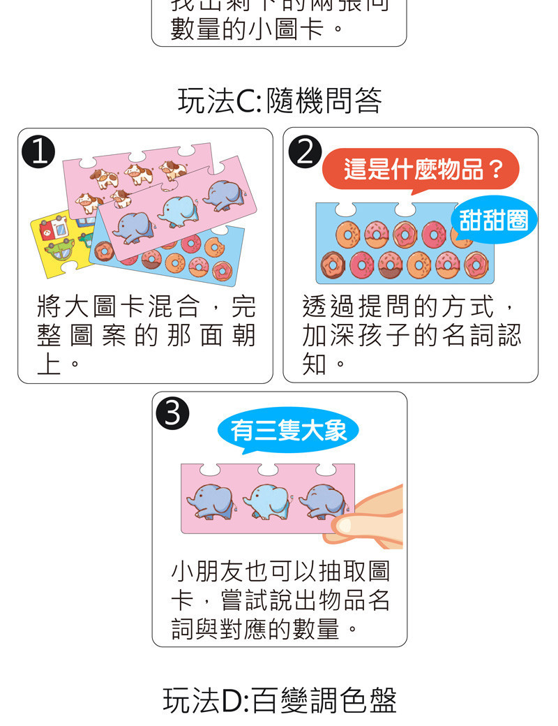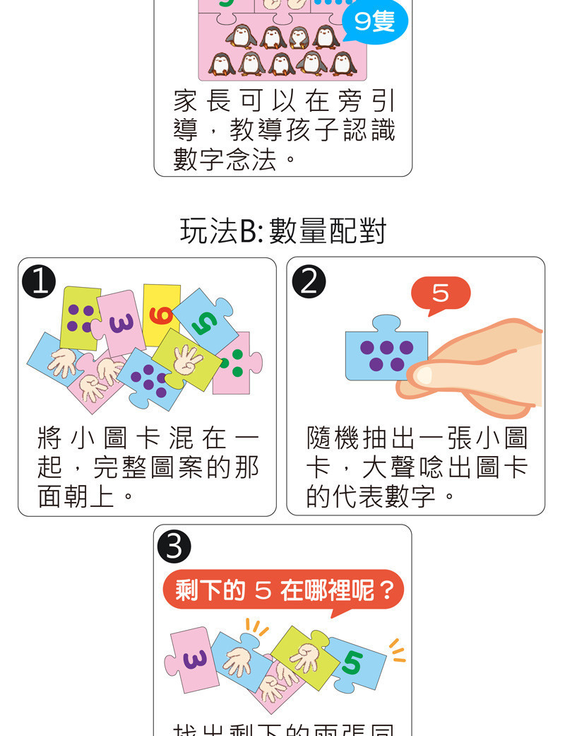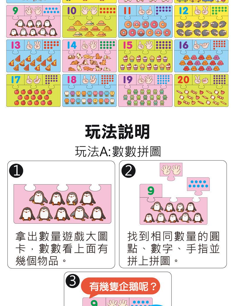 1. 數數拼圖:將同數量的物品、數字、手指、圓點拼成一組,強化數數能力。
