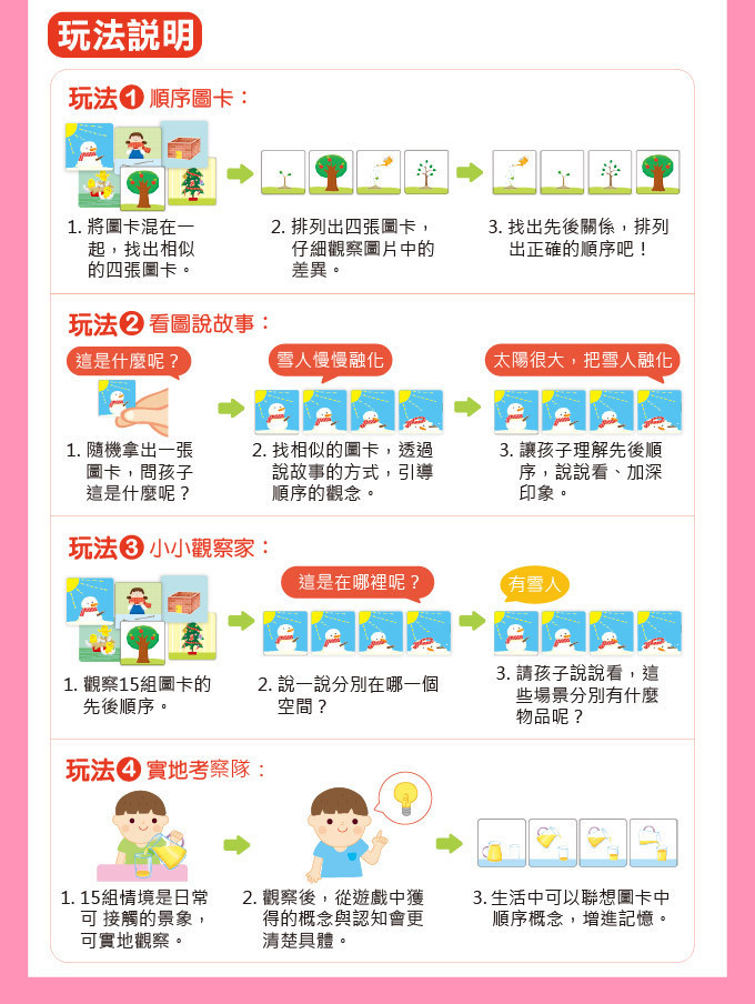 本產品內容豐富,含有60張圖卡,可組成15種情境,利用日常生活中常見的情境,讓孩子排列出順序,除了可以學習變化過程之外,同時也藉此讓孩子獲得社會行為認知,能在遊戲中達到學習的功能。