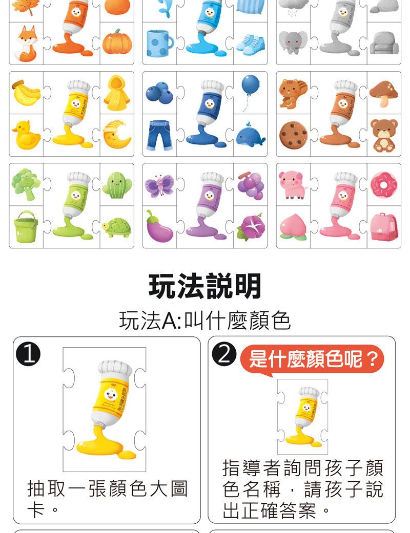 本產品內容豐富,含有12張感覺大圖卡、48張物品小圖卡,能夠幫助孩子學習色彩認知,並比較深淺色,培養顏色鑑別能力與藝術美學素養,並在遊戲中達到學習的功能。
