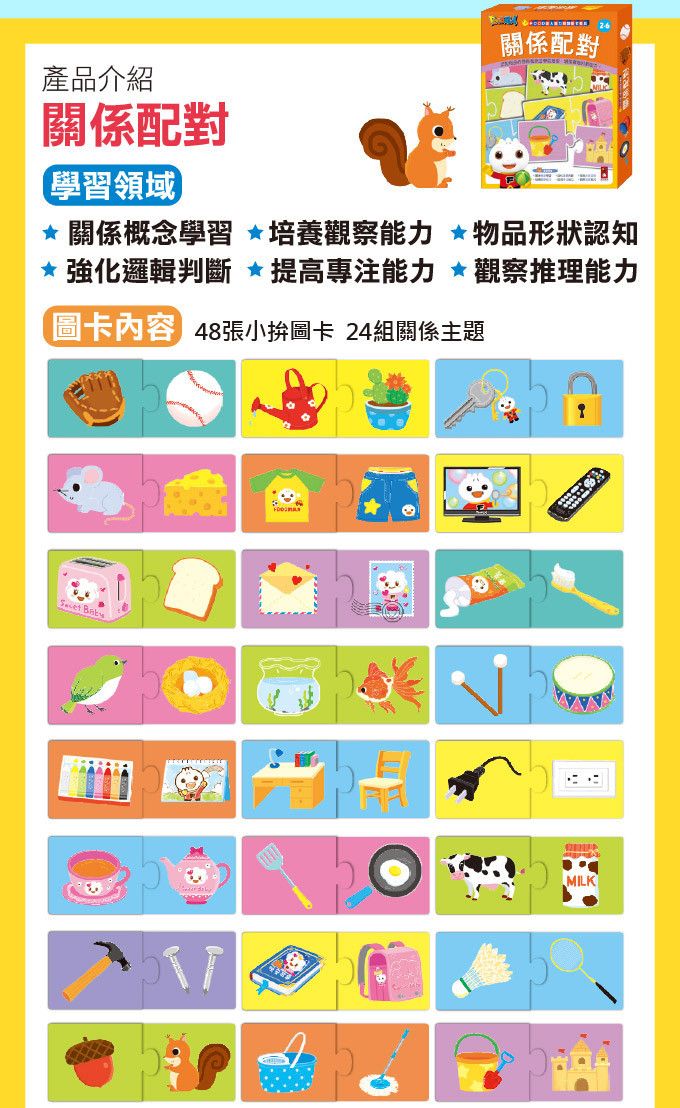 本產品內容豐富,含有48張可拆式拼圖圖卡,利用孩子常見的日常物品,讓孩子找出相關聯的配對,除了可以認識基本名詞之外,同時也培養孩子對於物品的關係概念,能在遊戲中達到學習的功能。
