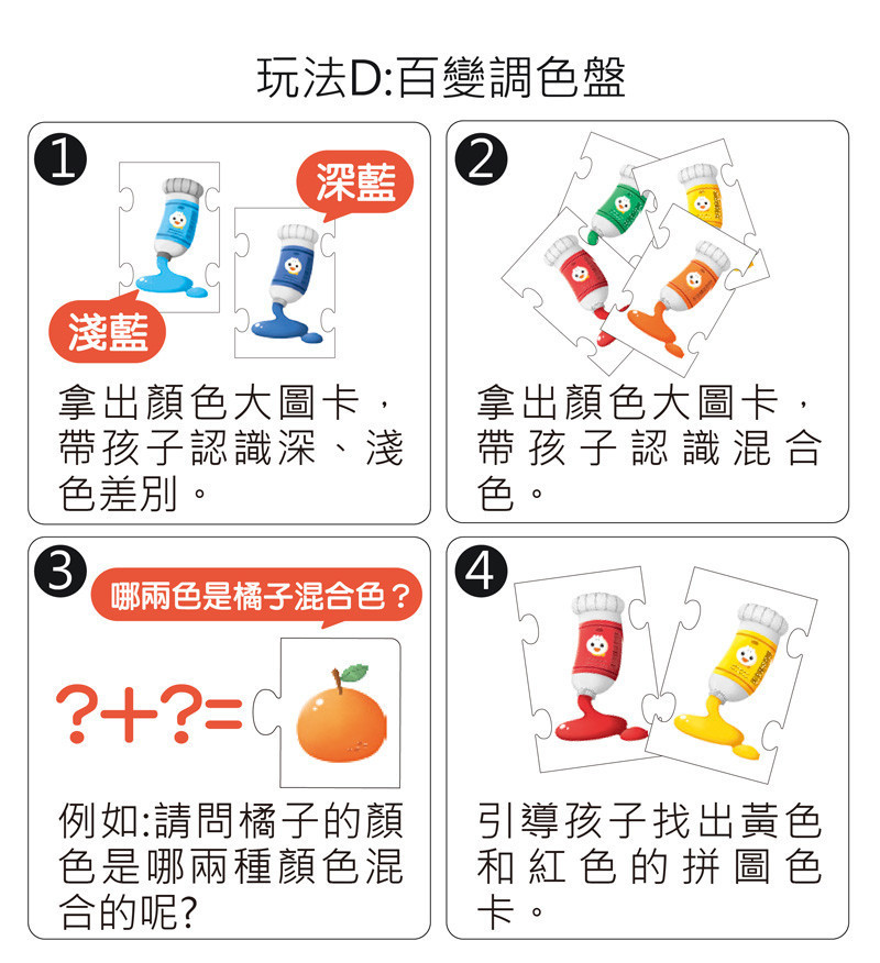 4. 百變調色盤:認識深色、淺色的顏色與物品,並帶孩子認識混合色,培養藝術美學。