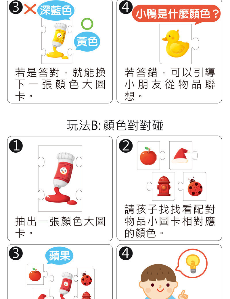 2. 顏色對對碰:抽取顏色大圖卡,找找配對物品小圖卡相對應的顏色,並舉一反三想想還有什麼物品有相同顏色。