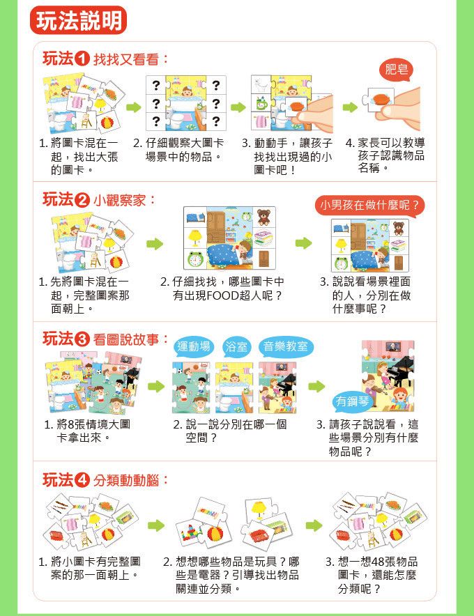 本產品內容豐富,含有8張情境大圖卡與48張可拆式拼圖圖卡,利用日常生活中常見的情境,讓孩子找找看看,找出相對應的圖卡,除了可以認識基本名詞之外,同時也加深孩子對物品與情境之間的基礎關係及概念,能在遊戲中達到學習的功能。