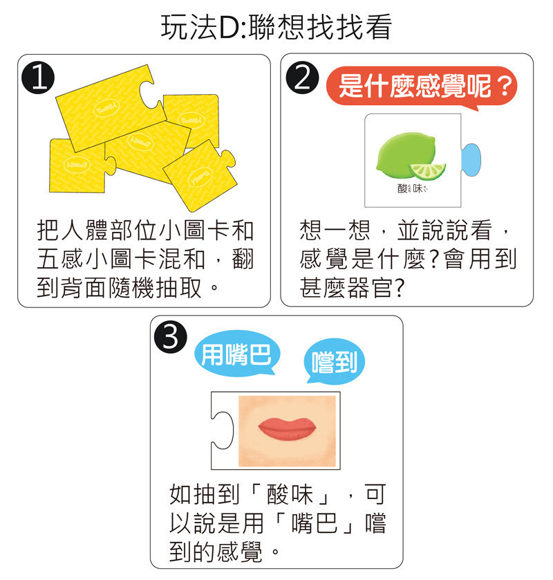 2. 感覺好奇妙:利用感覺拼圖,依大圖卡題目,拼組五感會體會到的變化,認識五感概念。