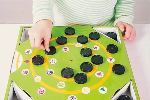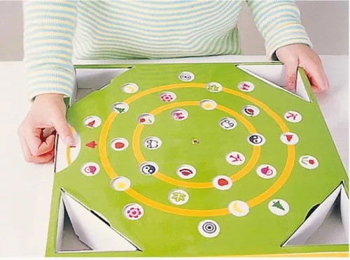3. 選擇盤面中兩個圓蓋子翻開,如果兩個圓洞內的圖案相同,就可以拿走這兩個蓋子,並且繼續遊戲,一直翻到兩個圓洞內的圖案不同時,再把蓋子蓋回去,輪到下一個人玩。