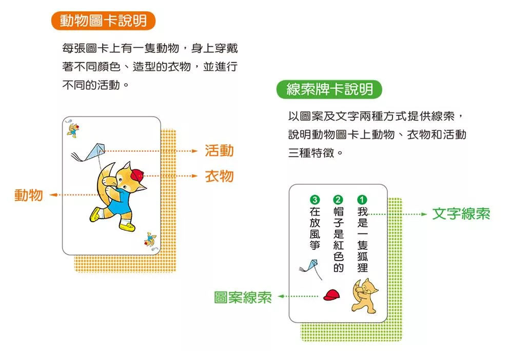 ※內容物:動物圖卡48張、語文線索牌48張、遊戲說明書一本