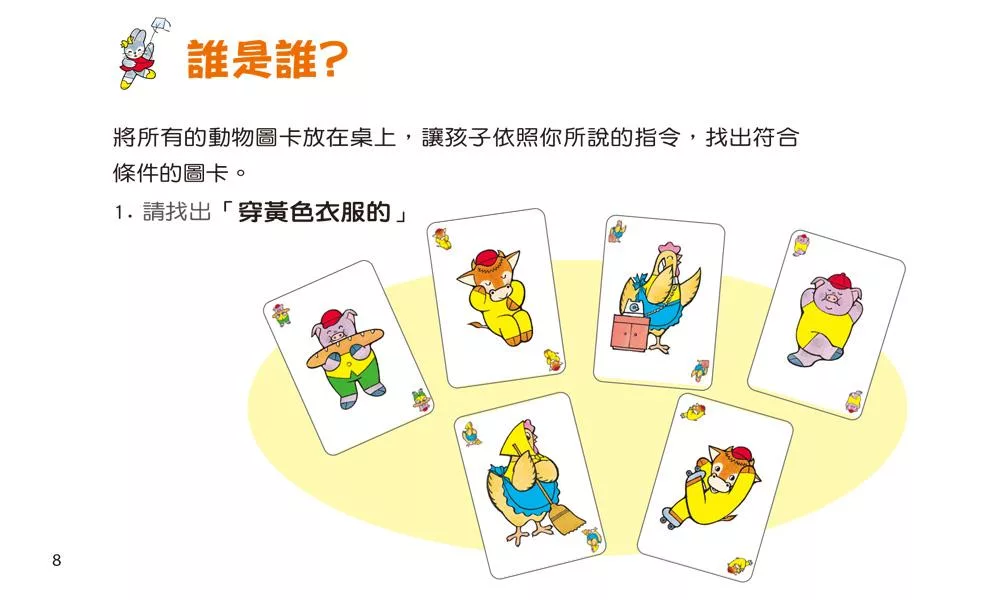 誰是誰歸類遊戲卡,是為設計嚴謹的語文活動。爸媽可以利用線索牌,引導孩子接觸不同的語文句型,並在觀察牌卡的圖像條件中,訓練孩子聽說、配對的能力,促使孩子對語文產生興趣。