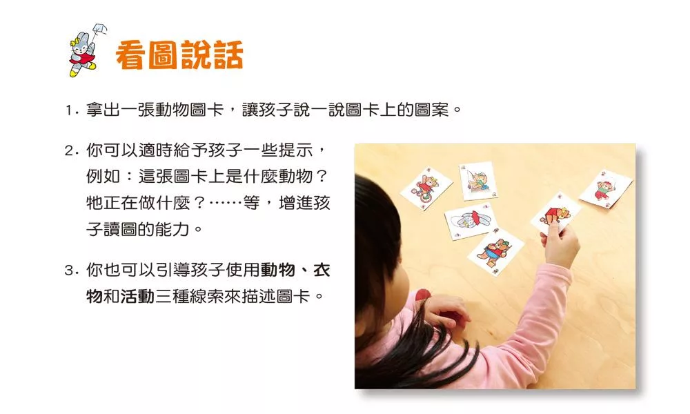 1.認識圖卡帶孩子認識圖卡上的動物、衣物和動作,引導他運用這三個線索來描述圖卡,增進語文表達的能力。