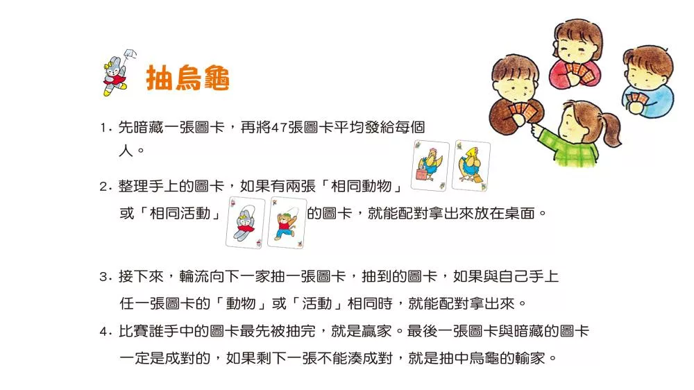 運用牌卡進行大團圓和抽烏龜遊戲。把歸類練習融入在傳牌、換牌、配對的遊戲中,不但能增進遊戲的趣味,更可提高學習的興趣。