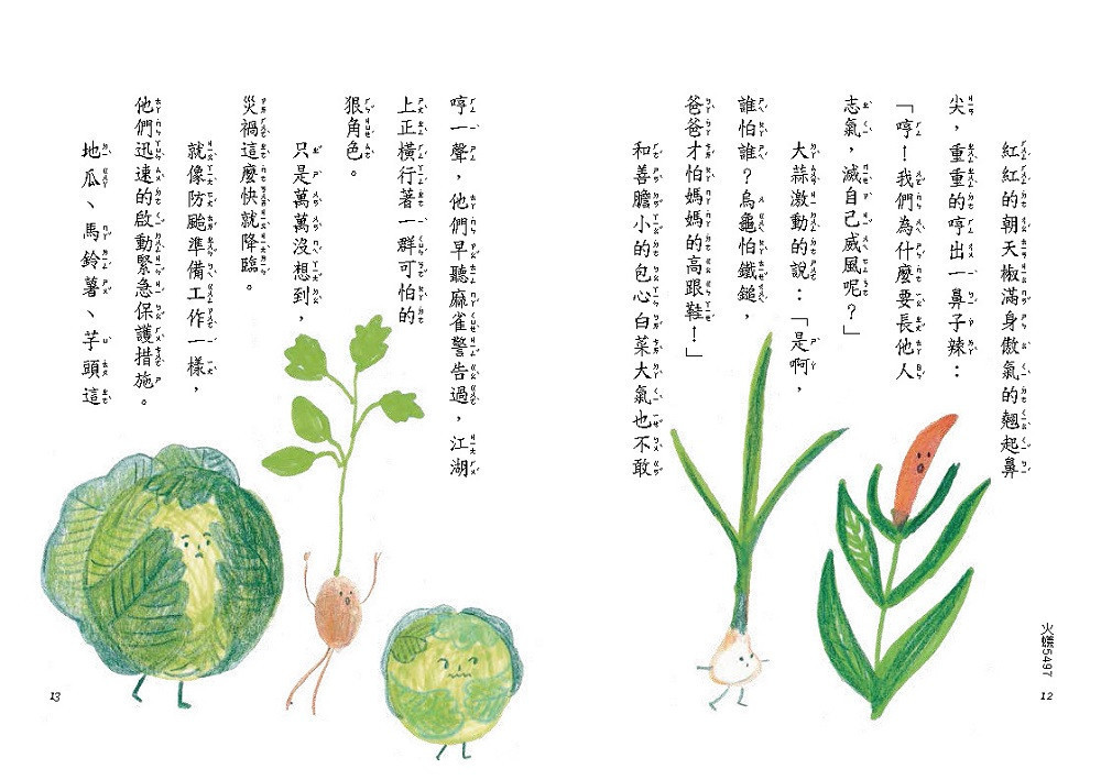 「全員聽令,各就各位──衝啊!」六萬名紅火蟻兵分三路,全速前進,目標正前方農地,有如一張離地漂浮的大紅毯。儘管蔬果們迅速啟動緊急保護措施,還是被啃的痛得哀嚎,而且根本沒法兒逃,連泥土裡的蚯蚓都無法倖免,不斷叫著:「唉唷喂呀,痛痛痛!」