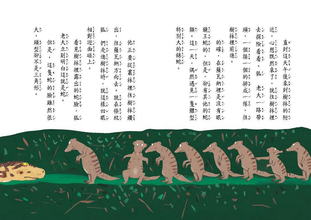 每天早上都要競速賽跑的河馬和犀牛、樂在臆測犀牛競速的虎豹三兄弟、忙裡偷閒的斑馬群和愛惡作劇的歐卡皮鹿,以及試圖和大蟒蛇打架的條紋狐獴,還有為了爭論銀河到底是不是河的老鷹和非洲雕鴞……