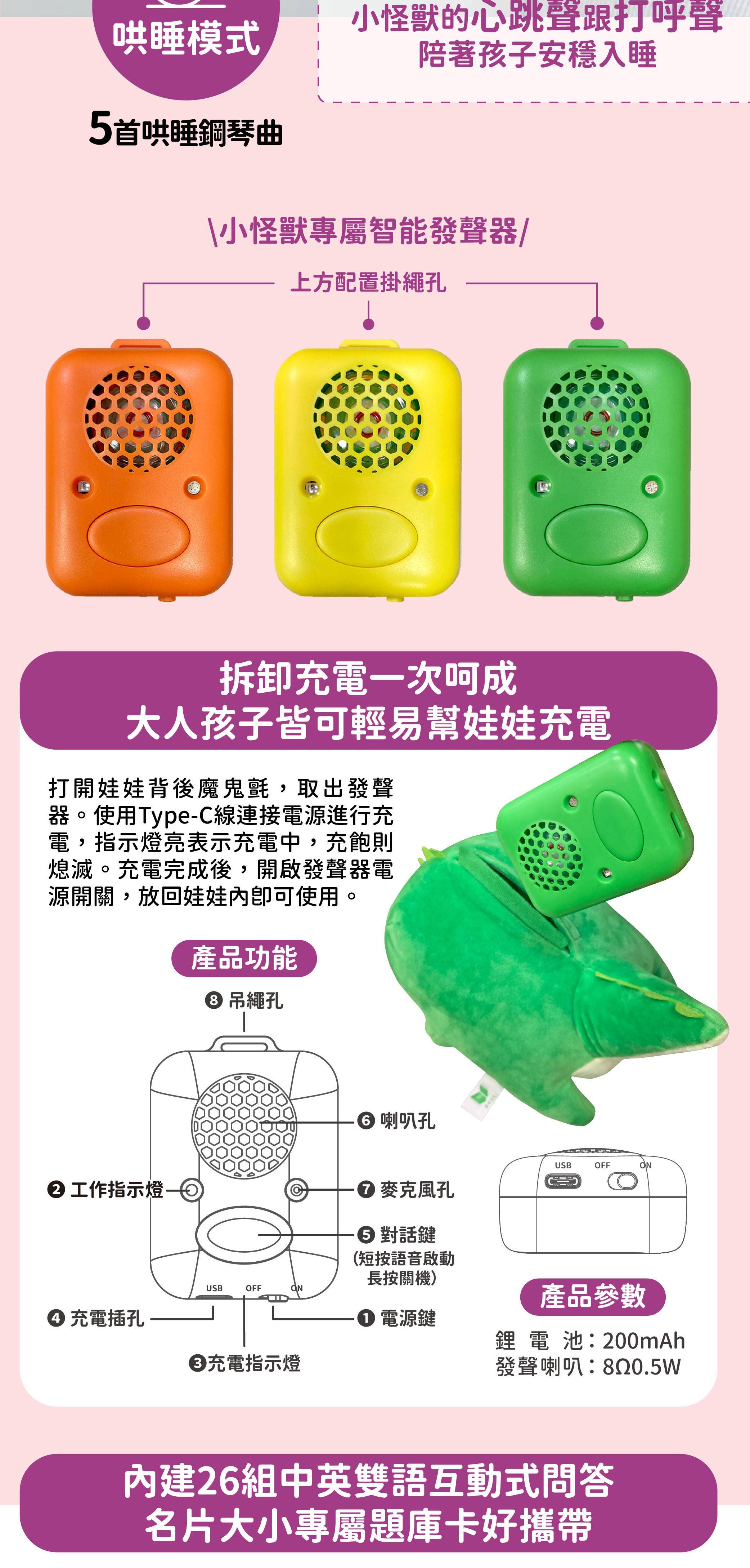 向小怪獸說晚安後,即會隨機播放5首哄睡鋼琴曲,搭配小怪獸平穩的心跳聲,陪伴孩子安心入睡!