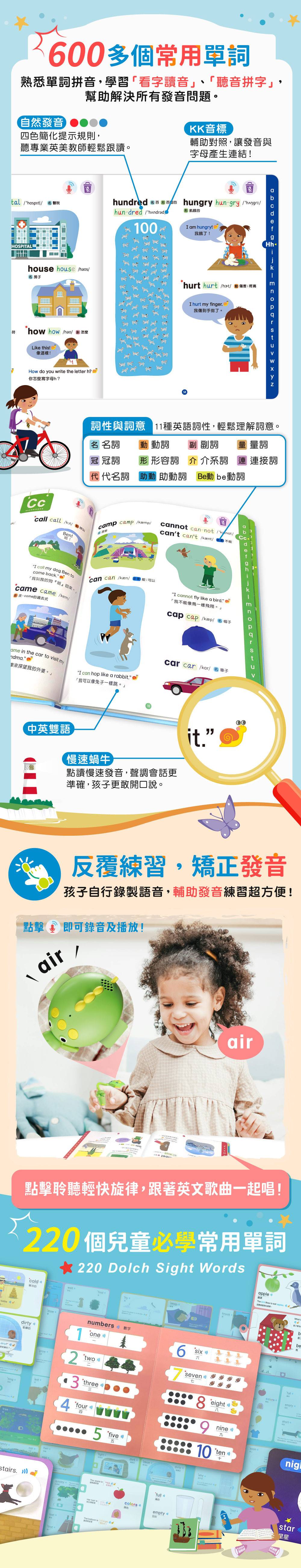 - 標準發音,輕鬆跟讀:內含中英文共計 4241 個標準發音檔,由外國專家錄製,讓孩子隨時隨地都能聽見標準的英語發音,輕鬆跟讀。